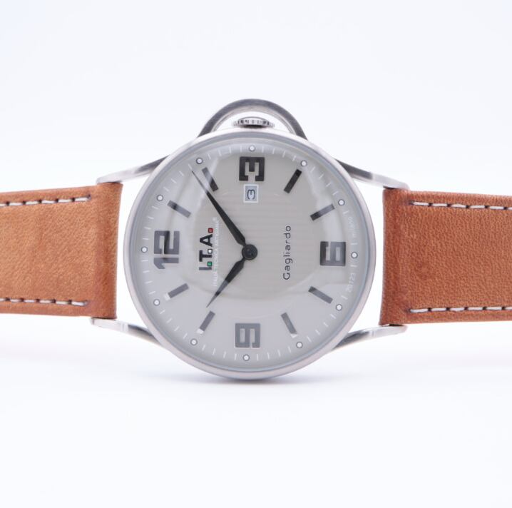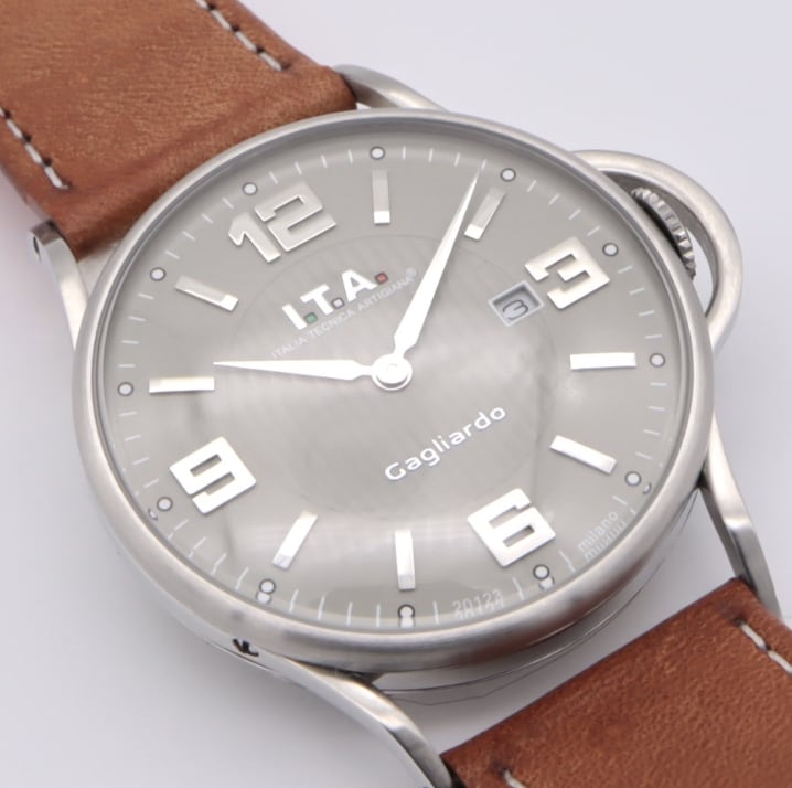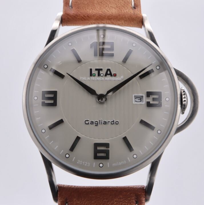 I.T.A Ref.23.00.01「Cagliardo」は、イタリアらしい色気と実用性を併せ持つクォーツモデル。落ち着いたグレーダイヤルに立体的なアラビアインデックスを配し、主張しすぎない存在感が魅力です。特徴的なリューズガード付きケースは程よいボリューム感があり、腕元に男らしさをプラス。ブラウンレザーストラップが全体を引き締め、カジュアルからジャケットスタイルまで幅広く対応します。派手さよりも“雰囲気”で差をつけたい方、人と被らない機械式時計を探している方におすすめの一本です。