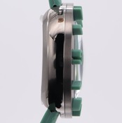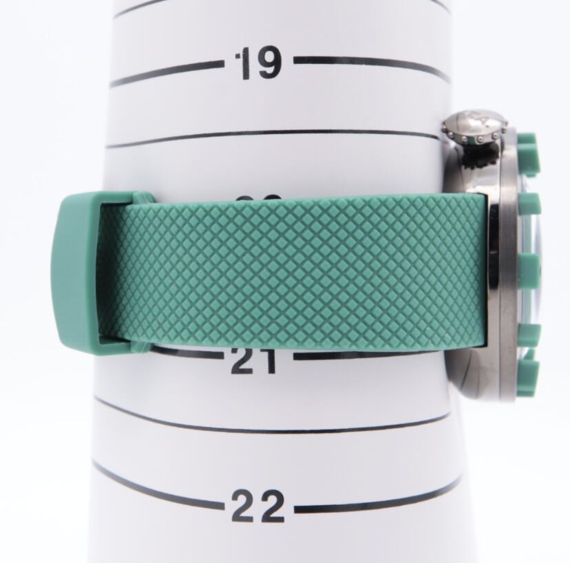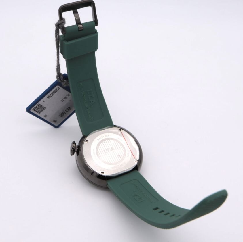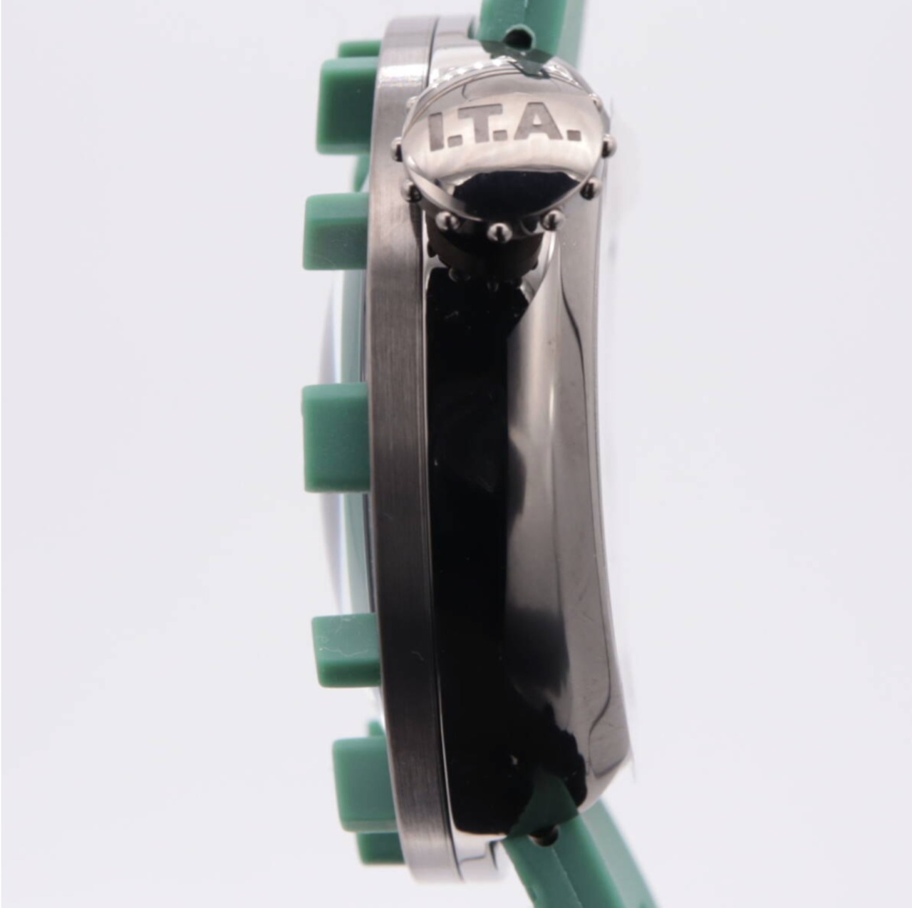I.T.A Ref.31.00.11は、イタリアンデザインの個性を前面に押し出した「DISCO VOLANTE」シリーズのクォーツモデル。重厚感あるケースに、マットな質感のダークダイヤルとグリーンの立体インデックスを組み合わせ、無骨さと遊び心を両立した一本です。ラバーストラップのミリタリーテイストが全体の印象を引き締め、腕元に確かな存在感を演出。視認性の高い針とインデックスにより、デザイン性だけでなく実用性も十分。シンプルな服装に合わせるだけで主役になるため、人と被らない時計を探している方や、ファッションのアクセントとして楽しみたい方に最適です。