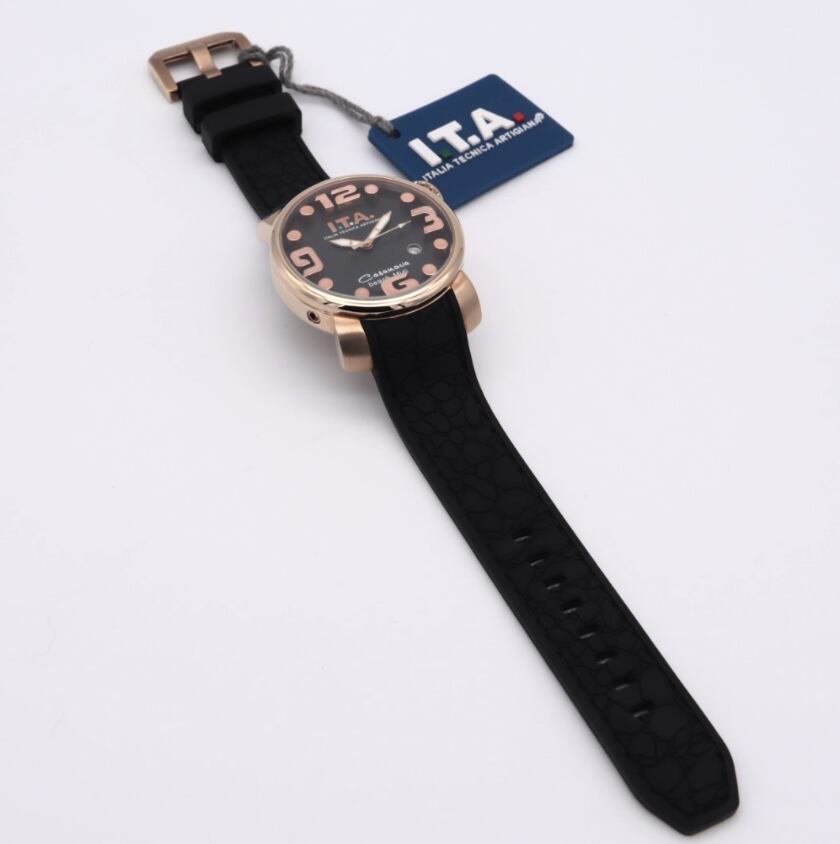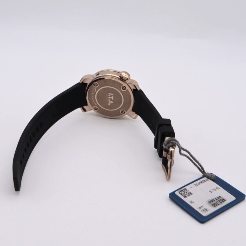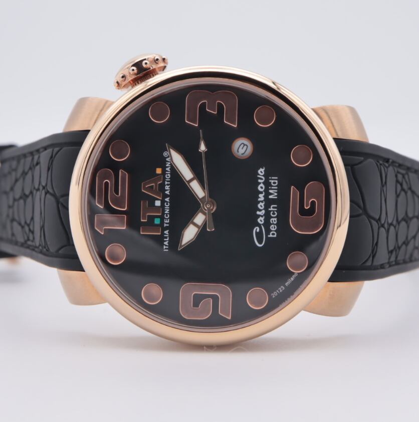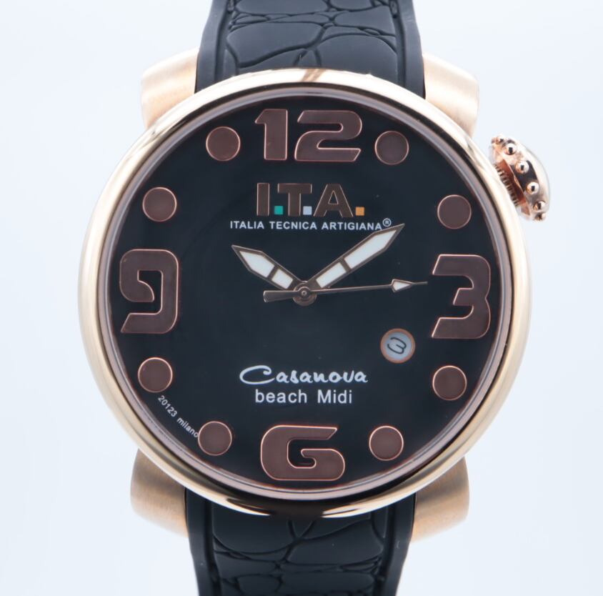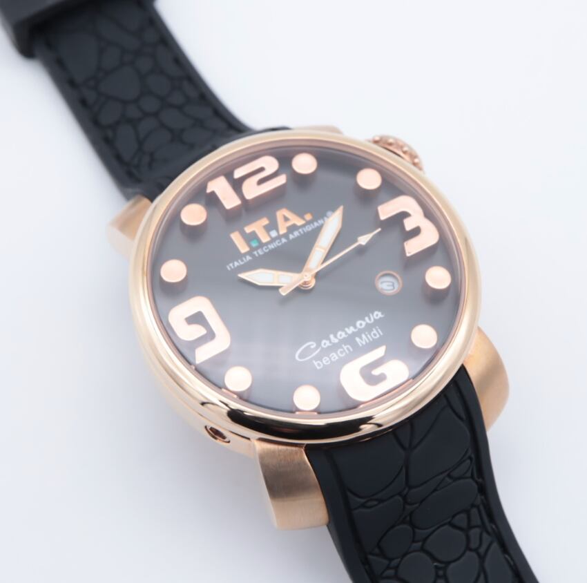 I.T.A Ref.19.03.16「Casanova beach Midi」は、ブラックダイヤルにローズゴールドカラーのインデックスを組み合わせた、上品さと華やかさを兼ね備えたモデルです。立体的なアラビア数字とドットインデックスが手元に程よい存在感を与え、アクセサリー感覚でも楽しめるデザイン。ローズゴールドケースが柔らかさを演出し、ブラックのラバーストラップが全体を引き締めます。カジュアルにもきれいめにも合わせやすく、普段使いからお出かけまで幅広く活躍。人と被らないデザインを求める方や、コーディネートの主役になる時計をお探しの方におすすめの一本です。