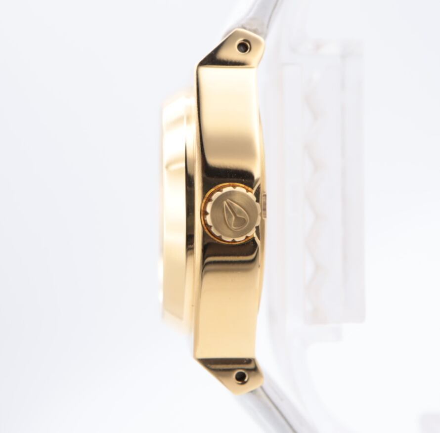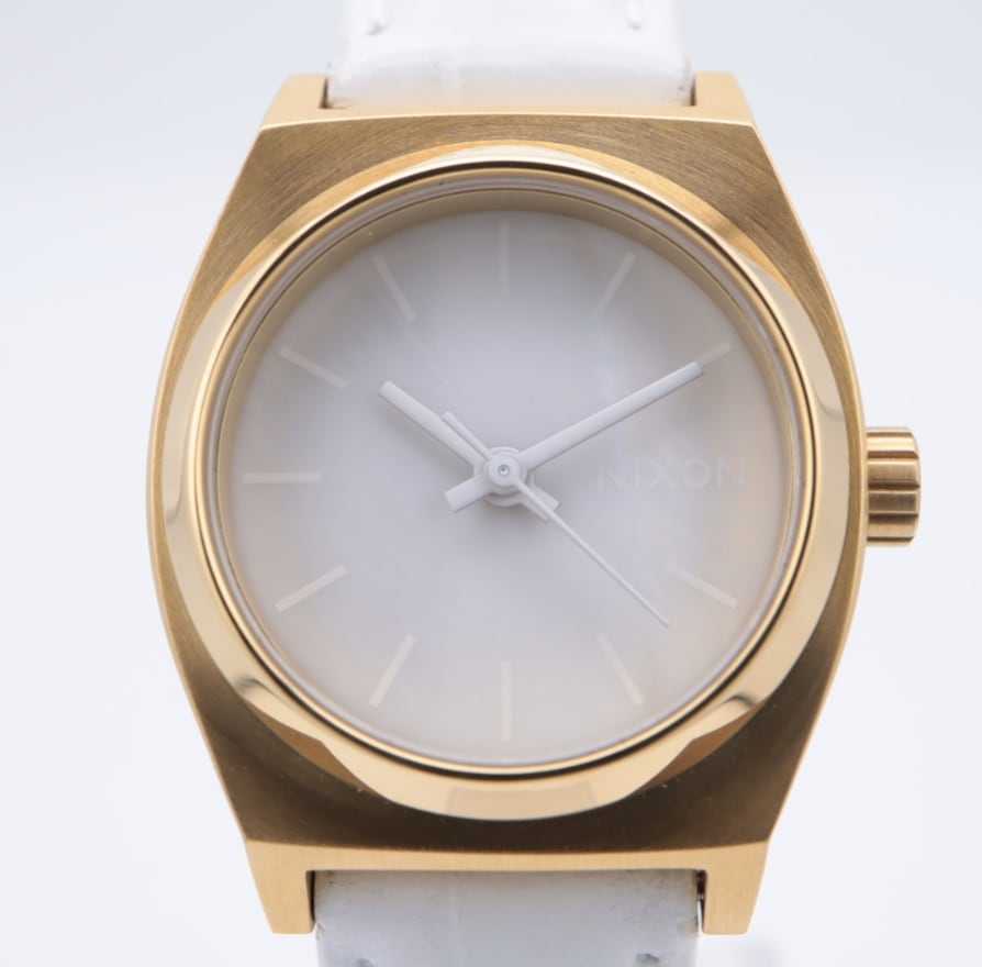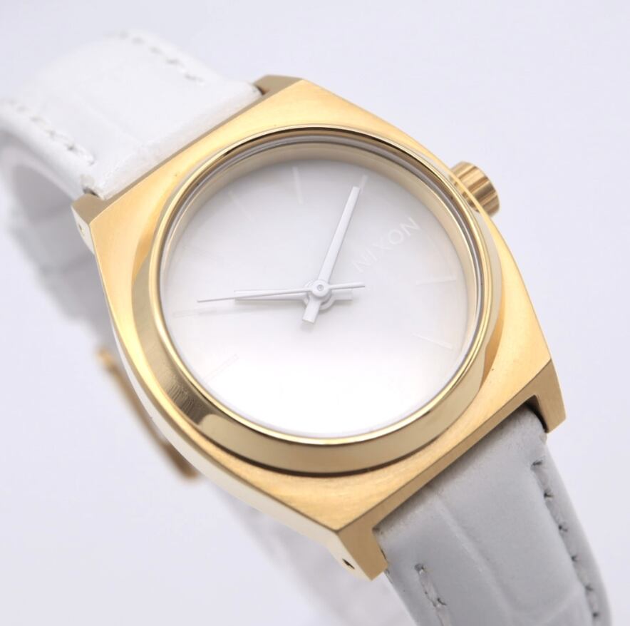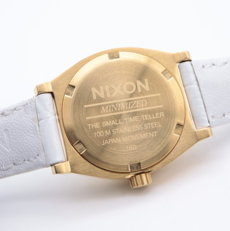 ゴールドケースとホワイトダイヤルを組み合わせた、NIXONらしい洗練されたデザインのアナログウォッチ。