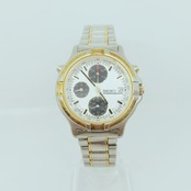 洗練されたデザインが魅力のSEIKOクロノグラフ腕時計です。美しい白の文字盤は、シンプルながらも存在感があり、ビジネスシーンやカジュアルスタイルにも幅広くマッチします。シルバーとゴールドのコンビネーションが高級感を演出し、腕元を華やかに彩ります。